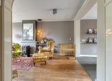 Via de mooie voordeur is de hal te bereiken die, net als de rest van de woning, smaakvol is verbouwd. Op de vloer liggen robuuste plavuizen, dat goed past bij het behang en de houten betimmering op de muren. Rechts in de hal zijn de trapopgang, toiletruimte en er is een trap naar de wijn-/trapkelder.