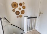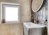 In 2024 is de badkamer vernieuwd, met gebruik van mooie materialen in warme kleuren. De ruimte is ingedeeld met een ruime douche en een wastafelmeubel. Fraaie elementen zijn de koperkleurige kranen, de ronde spiegel met verlichting en de stijlvolle wandtegels.