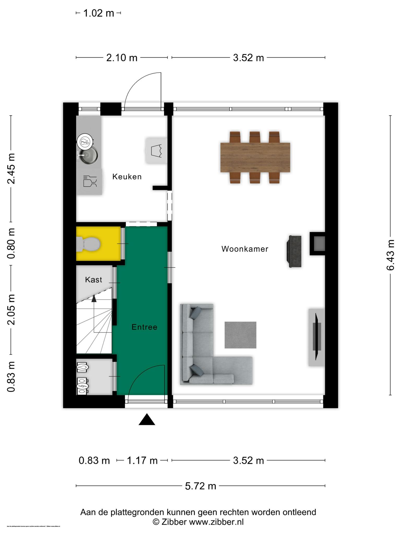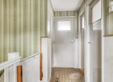 De hal is niet alleen ruim, maar ook heel licht dankzij de ramen in de voordeur. Aan de linkerzijde zijn de meterkast, de trapopgang met bergkast en de toiletruimte.