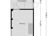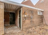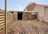De woning is toe aan een paar klushanden, en de voor- en achtertuin aan een paar groene vingers. In de achtertuin, op het noordoosten, staat een stenen (fietsen)berging met een overkapping. Onder de overkapping is een poort naar de steeg.