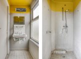 Aan de voorzijde, naast de trap, is de badkamer met een douche en een klassieke wastafel met marmeren achterwand. Creëer je een badkamer in de derde slaapkamer, dan kan de huidige badkamer worden verbouwd tot was-/toiletruimte.