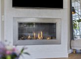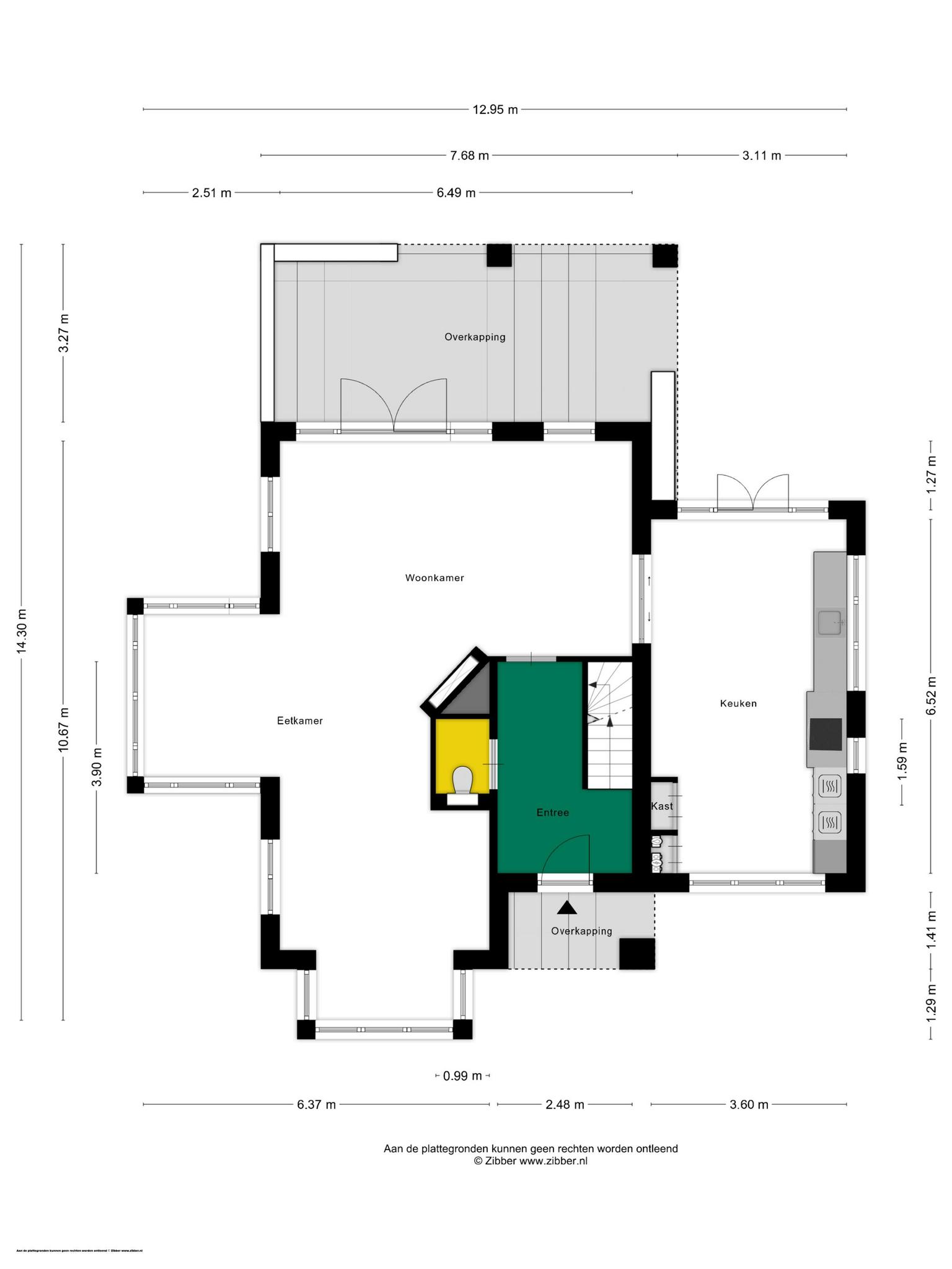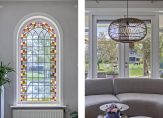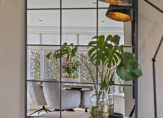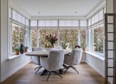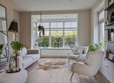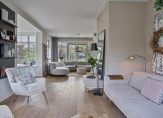 De woon-/eetkamer, royaal van formaat, heeft een speelse indeling en een optimale verbinding met de tuin. Aan de voorzijde is het zitgedeelte, het tv-gedeelte is aan de achterzijde en de royale erker is ingericht als eetgedeelte. Sfeermakers zijn het kleurrijke glas in loodraam, de houten vloer en de inbouw gashaard bij het tv-gedeelte.