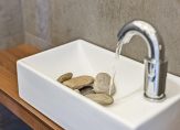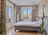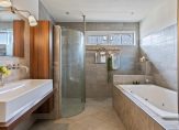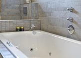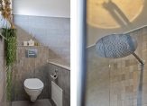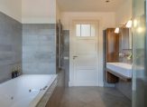 De badkamer etaleert luxe en comfort. Je hebt de beschikking over een whirlpoolbad, een ruime inloopdouche, een tweepersoonswastafel en, achter het muurtje, is het toilet. Stucwerk is gecombineerd met fraaie tegels en mooie kranen.