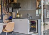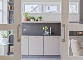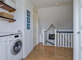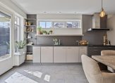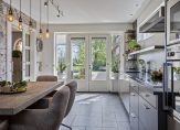 Twee stijlvolle schuifdeuren verbinden de woon-/eetkamer met de eetkeuken. Met ramen aan twee zijden en openslaande tuindeuren, geflankeerd door hoge ramen, is dit een heerlijk lichte ruimte. De keukenopstelling is geplaatst over bijna de hele lengte van de keuken, met een aanrechtblad van natuursteen en alle benodigde inbouwapparatuur.