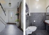 Wat een geweldige uitstraling heeft deze vrijstaande villa! Via de stapstenen in het gras loop je naar de overdekte entree van dit droomhuis. In de royale ontvangsthal zie je direct dat sfeer, luxe en comfort volop aanwezig zijn. Aan de rechterzijde zijn de fraaie trap naar de eerste verdieping en een trap naar de wijn-/provisiekelder. Het toilet bevindt zich links in de hal, met hoogwaardig sanitair en tegelwerk.
