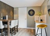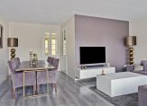 De woonkamer heeft een mooie indeling, met het zitgedeelte aan de voorzijde en een ruime erker. Hier staan nu een babybox en een speelkeukentje, maar een invulling als extra zitplek is ook mogelijk. Het eetgedeelte, waar nu een 6-persoonstafel staat, bevindt zich ook in de woonkamer.