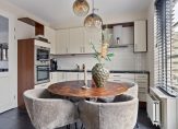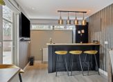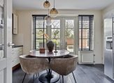 In de eetkeuken, aan de achterzijde, is ruimte voor een tweede eettafel. Een grote pui met openslaande deuren verbindt de keuken met de tuin en onder de donkere tegelvloer ligt vloerverwarming. De lichte hoekopstelling (2004) met lades, onder- en bovenkasten biedt veel bergruimte en het aanrechtblad is van fraai natuursteen. Een groot deel van de apparatuur is ingebouwd: een inductie kookplaat (2019), afzuigkap, vaatwasser (2023), heteluchtoven en een magnetron. Ook de losse, grote koel-/vriescombinatie blijft achter waardoor de keuken gebruiksklaar is.