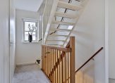 Het raam in de zijgevel zorgt voor lichtinval bij de trap en op de overloop, waar een airco-unit hangt. Vanaf de overloop zijn drie slaapkamers te bereiken, met tapijt op de vloer en warme kleuren op de muren.