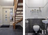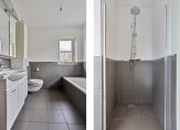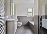 De badkamer, met een raam in de zij- en achtergevel, is afgewerkt met witte en grijze tegels. Je hebt de beschikking over een ligbad, separate douche, wastafelmeubel, tweede toilet en een hoge wandradiator.