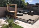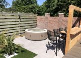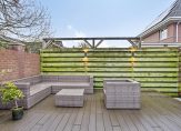 Vanuit de keuken is de achtertuin te bereiken, gesitueerd op het oosten. Het is een fraaie buitenruimte, boordevol sfeer en met meerdere terrassen om buiten te zitten. Er is een barretje gemaakt en de palmbomen, verlichting en mooie tegels maken de tuin meer dan af.