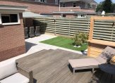 De oprit is verbreed, waardoor er twee auto’s naast elkaar kunnen staan. Ook de carport kan worden gebruikt om een auto neer te zetten en de laadpaal is een pluspunt voor de elektrische rijder. Rechts van de berging en tuinkamer is een pad, richting de achtertuin.
