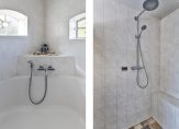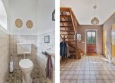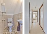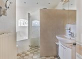 De twee laatste ruimtes op de begane grond zijn de badkamer en toiletruimtes. Hier zie je, net als in de bijkeuken, een fraai stalraam. De badkamer is ingedeeld met een hoekbad, inloopdouche en een wastafelmeubel.