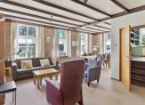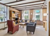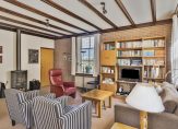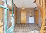 In de hal zijn de open, houten trap naar de eerste verdieping en maar liefst zes deuren. Een van deze deuren geeft toegang tot de wijn-/provisiekelder. Naast deze trap is de L-vormige woon-/eetkamer, met lichtinval aan drie kanten en prachtig uitzicht naar de tuin. Blikvangers zijn de glas-in lood bovenramen en de houtkachel, die de ruimte snel verwarmt waardoor de radiatoren uit kunnen blijven. Een mooi, origineel detail is de opkamer, die als thuiswerkplek is ingericht.