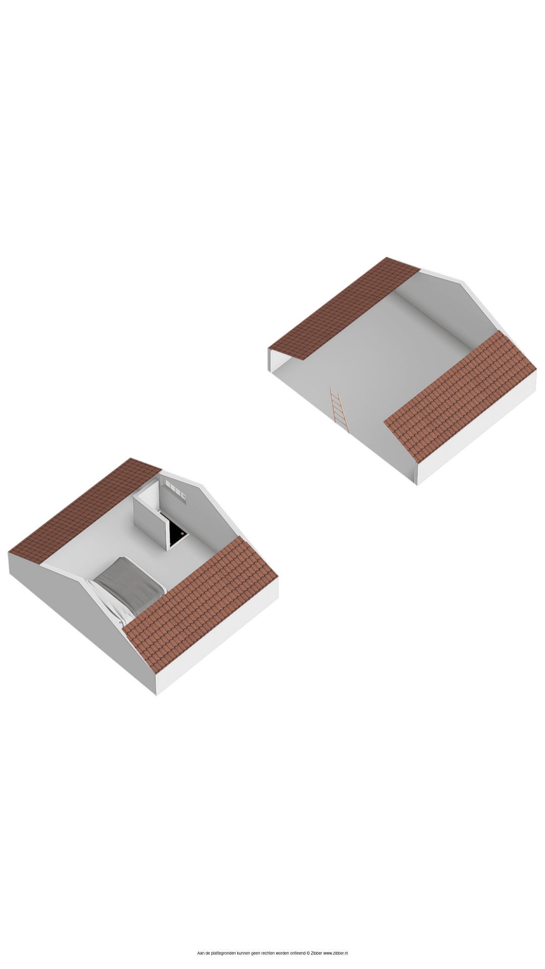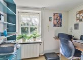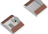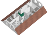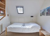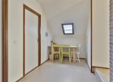 Volg de trap in de hal, die leidt naar een ruime overloop. Bij het dakraam is plek voor een bureau en verder zie je een brede garderobekast en een lage deur naar een van de bergingen in de schuinten van het dak. Naast de trap is, heel handig, een toiletruimte.