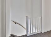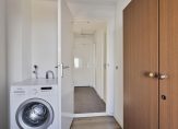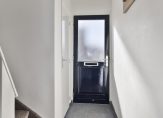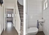 De hal is, net als de rest van de woning, in 2018 verbouwd. De muren zijn gestuct, nadat de elektra is vernieuwd, en de tegelvloer ligt ook in de keuken en een deel van de woonkamer. Rechts in de hal zijn de toiletruimte met fonteintje en de trapopgang met handige bergkast.