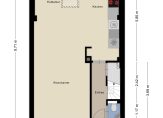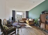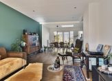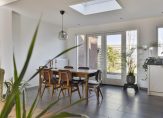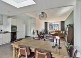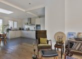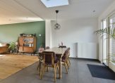 Vanuit de hal is de keuken te bereiken, die in open verbinding met de woonkamer staat. Er is een grote uitbouw gerealiseerd, waardoor er een leefruimte van totaal circa 45 m² is ontstaan. Het ruime zitgedeelte met eikenhouten vloer bevindt zich op de plek wat vroeger de hele woonkamer was. Het eetgedeelte, met een lichtkoepel en openslaande tuindeuren, bevindt zich aan de achterzijde.