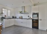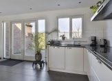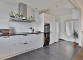In de keuken staat een lichte hoekopstelling (2018) van goed formaat, met een granieten aanrechtblad. De inductie kookplaat, afzuigkap, vaatwasser, combi-oven en wijnkoeling zijn ingebouwd. Het plafond in de keuken is, net als in de woonkamer, voorzien van inbouwverlichting.
