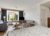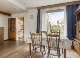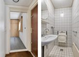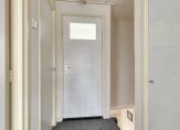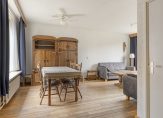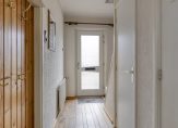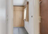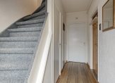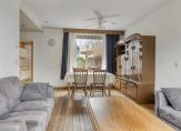 In de hal, aan de linkerzijde, zijn de trapopgang met trapkast en de toiletruimte. Op de plek waar vroeger de deur naar de woonkamer was, is de garderobe gemaakt. De houten vloer ligt ook in de aansluitende, L-vormige woonkamer. Aan de voorzijde, met de fijne ochtendzon, is het zitgedeelte en het eetgedeelte bevindt zich aan de achterzijde.