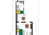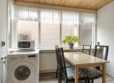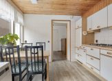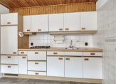 De keuken is verplaatst naar de aanbouw. Hierdoor is niet alleen de woonkamer een stuk groter geworden, dit geldt ook voor de keuken. Er is plek voor een ontbijttafel en er staat nu een 3 meter lange wandopstelling, voorzien van diverse inbouwapparatuur: een gaskookplaat, afzuigkap en een koelkast.