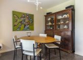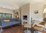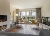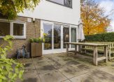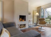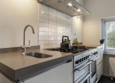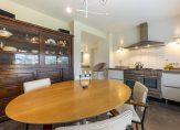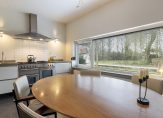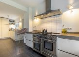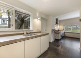 De lichte woonkamer met parketvloer is een sfeervolle leefruimte met een moderne open haard en twee schuifdeuren naar de tuin. Het uitzicht naar de tuin is fraai, zowel aan de voor- als achterzijde, waardoor de woonkamer ook heel licht is. In de L-vormige eetkeuken is genoeg ruimte om gezellig samen te eten, waar bezoek aanschuift voor een kop koffie en waar kinderen na schooltijd over hun dag vertellen. De keukenopstelling bestaat uit twee delen, met een fraai Falcon gasfornuis en alle benodigde inbouwapparatuur.