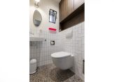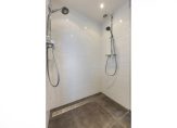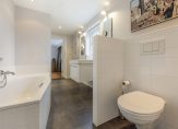 Modern sanitair, fraai tegelwerk en een donkere tegelvloer maken de badkamer tot een fraaie ruimte. De ruimte is ingedeeld met een ligbad, een dubbele inloopdouche, een nis met toilet en een tweepersoons wastafelmeubel.