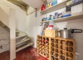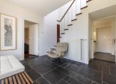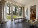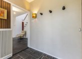 Bij de entree ligt, net als in de ruime hal, een donkere leisteen vloer die bij verschillende interieurstijlen past. Aan de rechterzijde is de toiletruimte en in de hal is de klassieke trap naar de eerste verdieping. Verrassend is het zitgedeelte in de hal, met prachtig uitzicht naar de tuin. De wijn-/provisiekelder, met een oppervlakte van circa 10 m2, is vanuit de hal te bereiken.