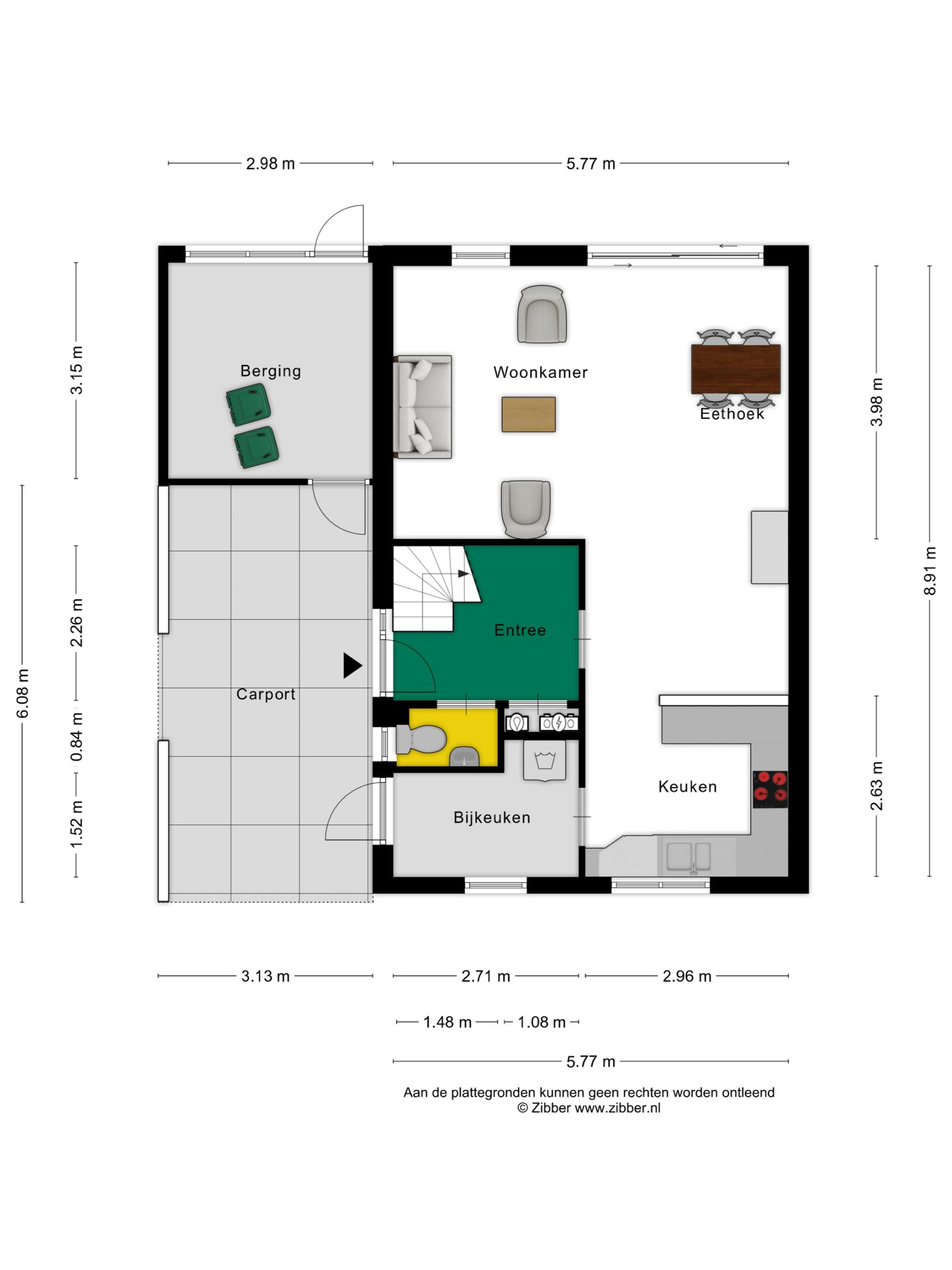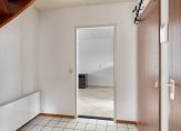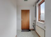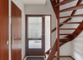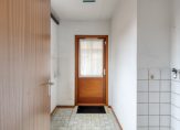 Bij de carport zijn maar liefst drie deuren. De eerste deur rechts is van de bijkeuken, de tweede deur is de voordeur en de deur recht voor je geeft toegang tot de (fietsen)berging. We gaan via de voordeur naar binnen en stappen de hal in, met een lichte tegelvloer en de hardhouten trap naar de eerste verdieping. Aan de rechterzijde, naast de meterkast, is de toiletruimte met fonteintje.