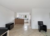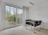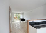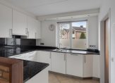 De tuingerichte, bijna 5.80 meter brede woonkamer, staat in open verbinding met de keuken. Zowel het zit- als het eetgedeelte is aan de zonnige zuidkant, met mooi uitzicht naar de tuin. Een schuifpui zorgt voor een optimale verbinding met het terras en de lichte, diagonaal gelegde tegelvloer ligt ook in de keuken.