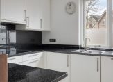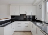 Achter het halfhoge muurtje is de keuken, waar een lichte U-opstelling staat. Het aanrechtblad en een deel van de achterwanden zijn van zwart graniet, wat de keuken een luxe uitstraling geeft. Alle benodigde apparatuur is ingebouwd: een keramische kookplaat, afzuigkap, vaatwasser en een koelkast. Naast de keuken is de verwarmde bijkeuken met de wasmachineaansluiting.