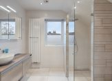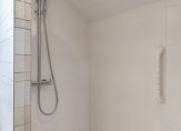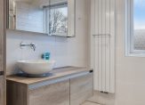 De moderne badkamer, uitgevoerd in lichte kleuren, is ingedeeld met een grote inloopdouche, een designradiator, een badmeubel met ronde waskom, een spiegelkast en een wandcloset. Hier hoef je niet te verbouwen, maar kun je direct beginnen met het neerzetten van je verzorgingsartikelen.