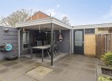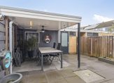 Vanuit de keuken loop je de achtertuin in, gesitueerd op het westen. Het overdekte terras biedt beschutting en de aansluitende berging/hobbyruimte heeft een oppervlakte van bijna 15 m2.