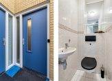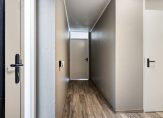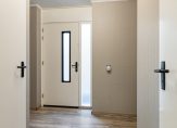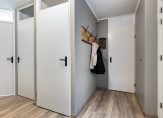 De hal is een mooie ontvangstruimte, met laminaat op de vloer en zwarte deurklinken. Rechts in de hal, bij de meterkast, is ruimte voor een garderobe en een van de andere deuren geeft toegang tot een berging. Hier hangt de HR-ketel en er is plek om de wasmachine en droger neer te zetten.