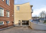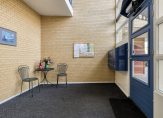 Aan de kant van de rotonde, naast de apotheek, is de entree van de appartementen. Hier zie je de brievenbussen, het bellentableau en de intercom. Eenmaal binnen kun je met de lift en trap naar de parkeergarage en de appartementen op de eerste verdieping. Erg handig: de binnendeuren zijn met een druk op de knop te openen.