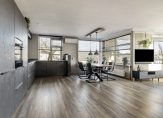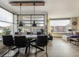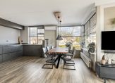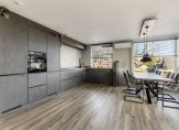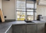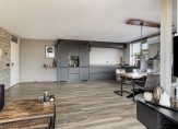 Verrassend is de grootte van de woonkamer met open keuken, met een totale oppervlakte van bijna 37 m2. Een van de wanden is afgewerkt met natuursteen, er ligt laminaat op de vloer en de kleur van de keuken past goed in het geheel. Bij het eetgedeelte hangt een airco-unit, die de hele ruimte kan koelen en verwarmen.