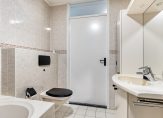 Vanuit de hal is er ook toegang tot de toiletruimte en de badkamer, waar diverse zwarte accenten zijn aangebracht. Je hebt niet alleen de beschikking over een douche, maar ook over een whirlpoolbad. Het badmeubel met wastafel biedt genoeg ruimte voor handdoeken en verzorgingsartikelen.