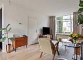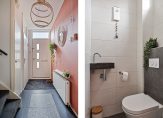 Via het pad in de voortuin bereik je de stijlvolle, recent vernieuwde voordeur. Zodra je binnenstapt, kom je in een royale hal die direct de warme sfeer van deze smaakvol gerenoveerde woning uitstraalt. Rechts in de hal bevinden zich de moderne toiletruimte met fonteintje, de meterkast en de trap naar de eerste verdieping.
