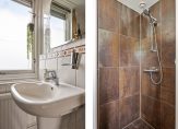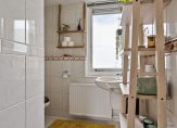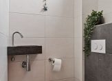 De badkamer is fris en licht dankzij de neutrale wand- en vloertegels. Hier vind je een moderne douche, een toilet en een wastafel: alles wat je nodig hebt voor een comfortabele start van de dag.