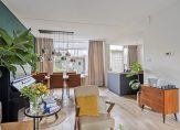 De woonkamer, met een indrukwekkende lengte van circa 8,5 meter, vormt samen met de open keuken een heerlijke, ruime leefomgeving. Aan de voorzijde bevindt zich het gezellige zitgedeelte, terwijl achterin ruimte is voor een royale eettafel voor zes personen – perfect voor lange diners of gezellige momenten met familie en vrienden. Dankzij de grote ramen, aan beide zijden voorzien van rolluiken, geniet je van een fraai uitzicht op zowel de voortuin als de achtertuin.