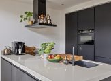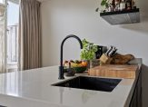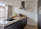 De open keuken sluit naadloos aan op de woonkamer en is voorzien van dezelfde elegante eikenhouten vloer. Het absolute middelpunt is het imposante kook- en spoeleiland, afgewerkt met een robuust composiet aanrechtblad. De keuken biedt volop opbergruimte dankzij de grote lades, kasten en een ingebouwde kastenwand. Alle moderne apparatuur is aanwezig: een inductiekookplaat, afzuigkap, vaatwasser, combi-oven en een koel-/vriescombinatie. Deze keuken, geplaatst in 2020, is ontworpen voor jarenlang kookplezier en gemak.