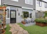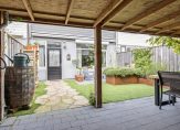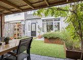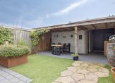 De achtertuin is onderhoudsvriendelijk ingericht met hoogwaardig kunstgras – nooit meer maaien! – en robuuste plantenbakken van cortenstaal in twee hoogtes, wat zorgt voor een speels en modern effect. Achterin de tuin bevindt zich een praktische berging voor fietsen en tuingereedschap, met daarnaast een handige verbrede poort die directe toegang biedt tot de achtergelegen steeg.
