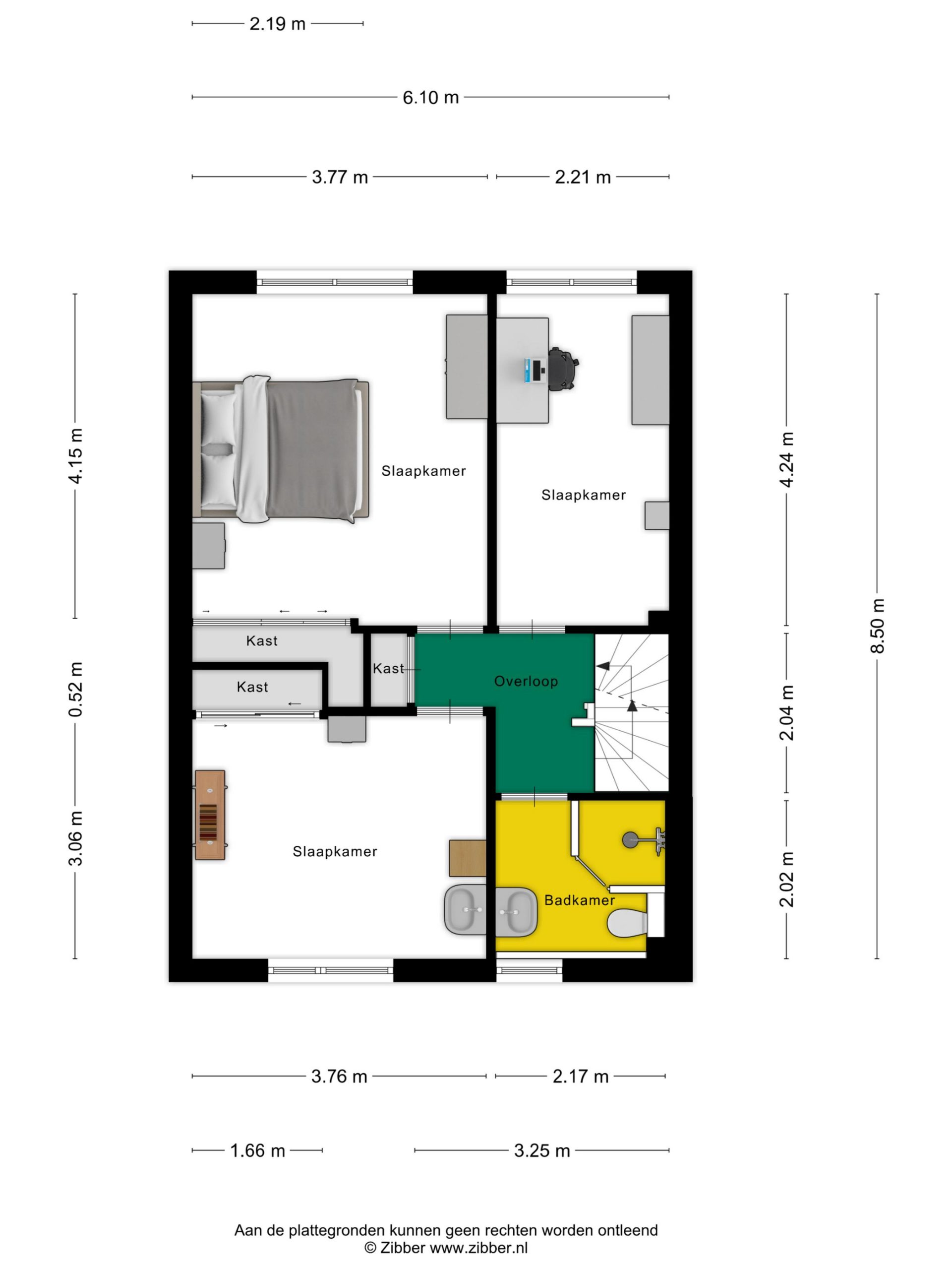 Aan de achterzijde bevindt zich de master bedroom, voorzien van een ingebouwde kastenwand die zorgt voor een opgeruimde uitstraling. Naast deze kamer ligt een tweede slaapkamer, momenteel ingericht als een rustige thuiswerkplek. Aan de voorzijde van de woning vind je de derde slaapkamer, eveneens uitgerust met een ingebouwde kastenwand én een eigen wastafel – een fijne extra!