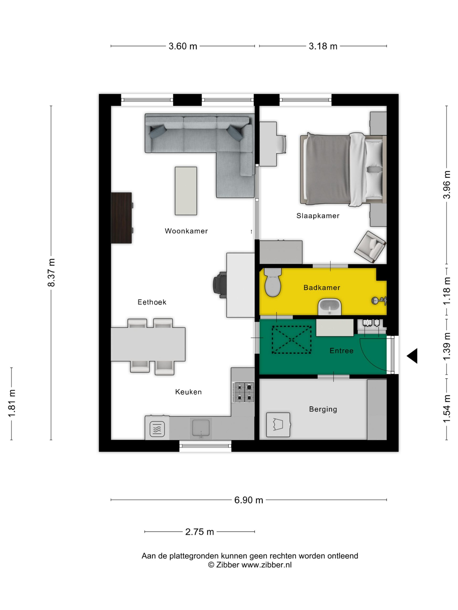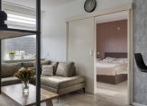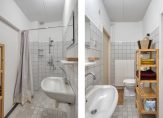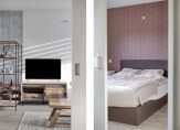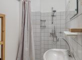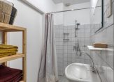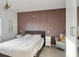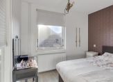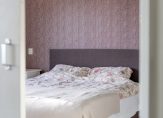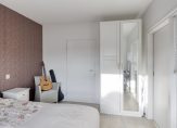 Een grote schuifdeur in de woonkamer geeft toegang tot de ruime tweepersoons slaapkamer, met stijlvol behang op de muur achter het bed. De naastgelegen badkamer is ingedeeld met een douche, toilet en een wastafel. Erg handig, vooral voor bezoek, is dat de badkamer ook vanuit de hal te bereiken is.