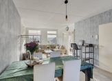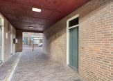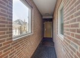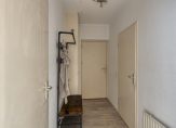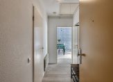 Met de trap ga je naar de eerste verdieping, en vervolgens via een overdekte galerij naar de voordeur van dit superleuke appartement. In de hal ligt, net als in bijna het hele appartement, een mooie laminaatvloer en naast de meterkast is genoeg plek voor een kapstok.