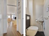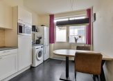 In de hal, aan de linkerzijde, zie je een bergkast en de toiletruimte met fonteintje. Rechts in de hal is de meterkast en een mooie plek om een kast neer te zetten. Vanuit de hal loop je de lichte woonkamer in, die aan de tuinzijde maar liefst 6.10 meter breed is. Op de vloer ligt pvc en de ruimte is goed in te delen met een zithoek, eettafel, een grote kast en een bureau. In de hoek van de woonkamer is de trap naar de eerste verdieping en in een andere hoek hangt een airco-unit waarmee je kunt koelen en verwarmen.