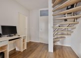 Een vaste trap geeft toegang tot de zolder, met een dakraam aan de voorzijde en twee zonnepanelen aan de achterzijde.