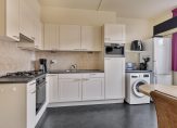 Naast het bureau is een deur naar de ruime keuken, waar een tweede eettafel kan staan. De lichte hoekopstelling met grijs aanrechtblad is in 2016 geplaatst. Aan bergruimte is geen gebrek en de gaskookplaat, afzuigkap, oven (2023) en magnetron zijn ingebouwd.