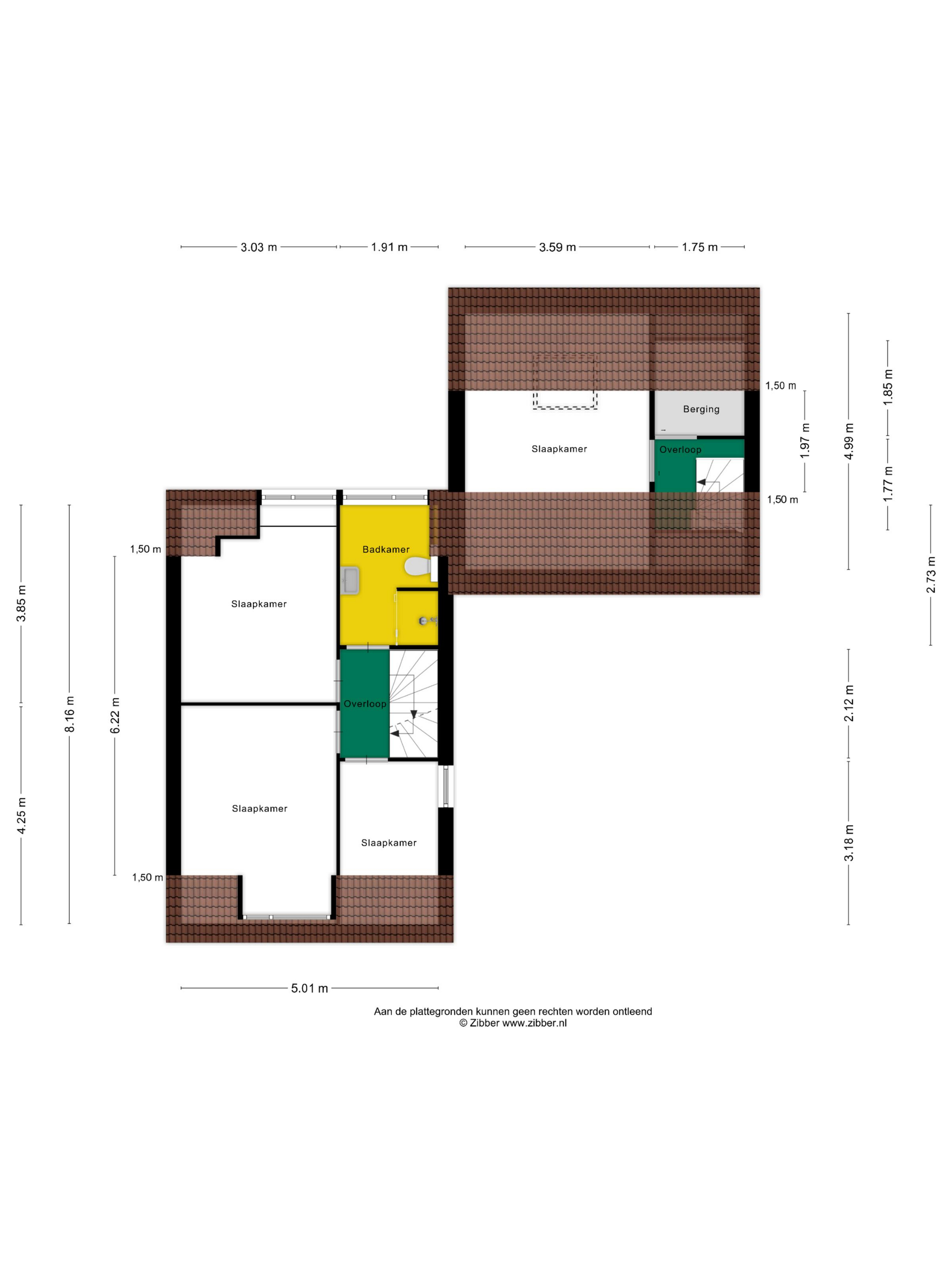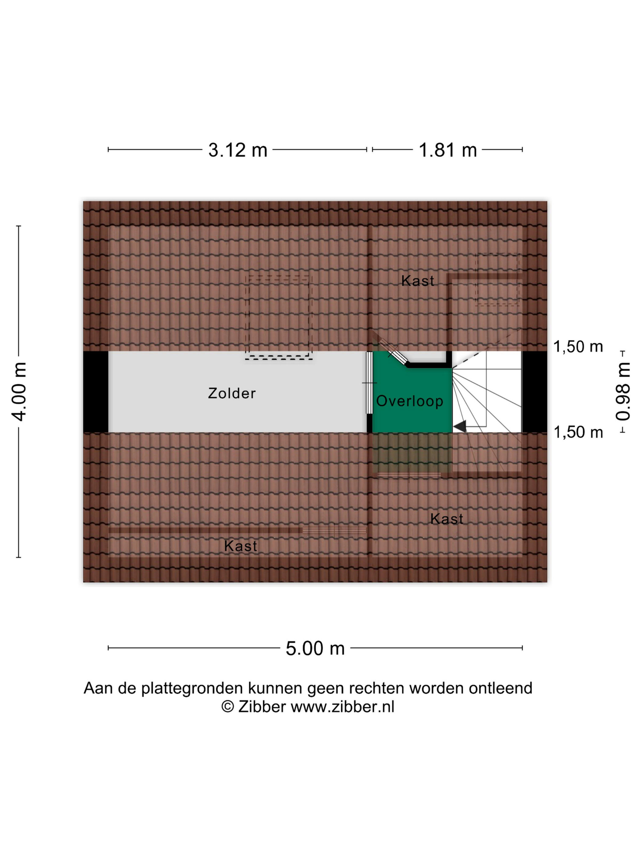 Een vaste trap leidt naar de tweede verdieping, waar meerdere bergingen en een slaapkamer zijn. Ook deze kamer heeft een groot dakraam en is, gezien de vloeroppervlakte, groot genoeg voor een tweepersoonsbed.
