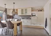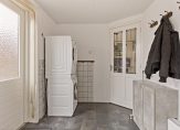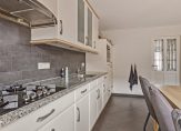 Achter de fraaie deur met ‘glas in lood’ is de eetkeuken, met een schuifpui naar de tuin. Een grote eettafel kan hier ruim staan en de lange wandopstelling met granieten blad is voorzien van diverse inbouwapparatuur: een gaskookplaat, afzuigkap, vaatwasser, koelkast en een combimagnetron. Naast de keuken is de bijkeuken met een deur naar de carport en een deur naar de achtertuin. In de bijkeuken, die door de bewoners als dagelijkse entree wordt gebruikt, is ruimte voor een vriezer en de wasapparatuur.
