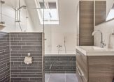 De moderne badkamer met dakraam is ingedeeld met een ligbad, inloopdouche, wandcloset en een stijlvol wastafelmeubel. De muren zijn betegeld in een mooie kleurencombinatie en de inloopdouche met glazen wand en deur trekt direct de aandacht.