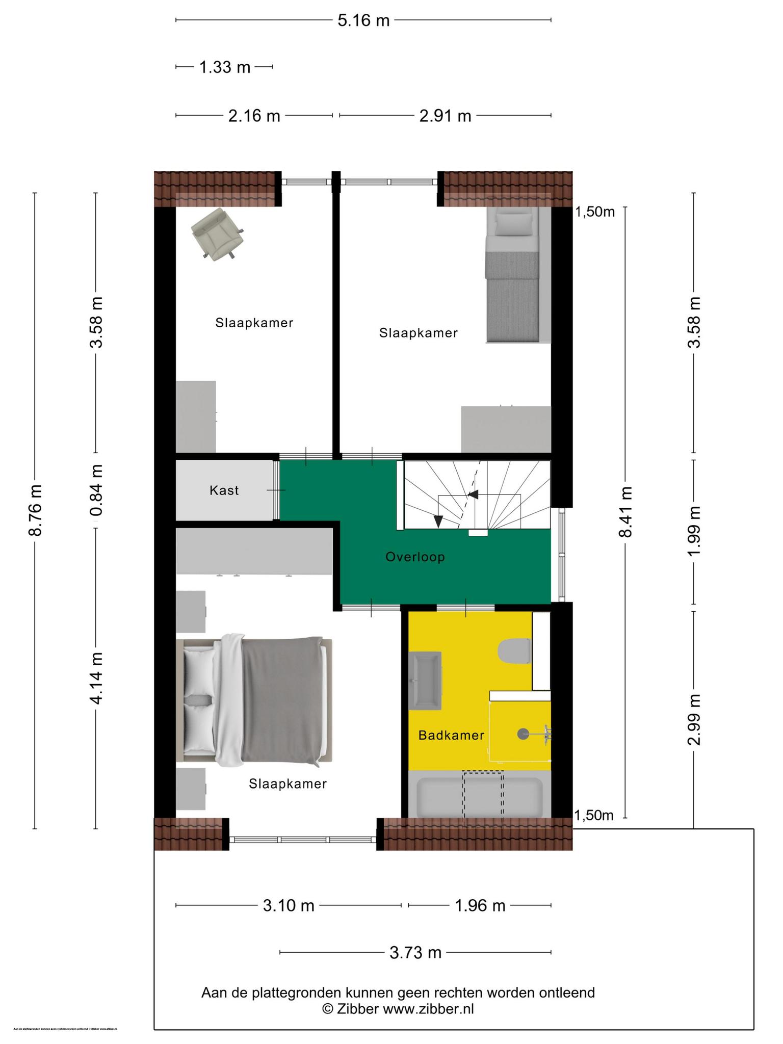 Vanaf de overloop zijn drie slaapkamers te bereiken, waarvan twee aan de voorzijde. Deze kamers hebben een gezamenlijke dakkapel en een nette, bruine laminaatvloer. Aan de achterzijde is de hoofdslaapkamer, met een dakkapel en een nis voor een grote garderobekast. In deze kamer ligt een laminaatvloer met een grijze tint.